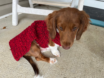 This was my first crocheted dog coat. I normally make them out of quilting fabric and batting with a third layer of flannel on the inside. I have to choose bright neon colors so that I can find the dogs when they wander off into the woods.