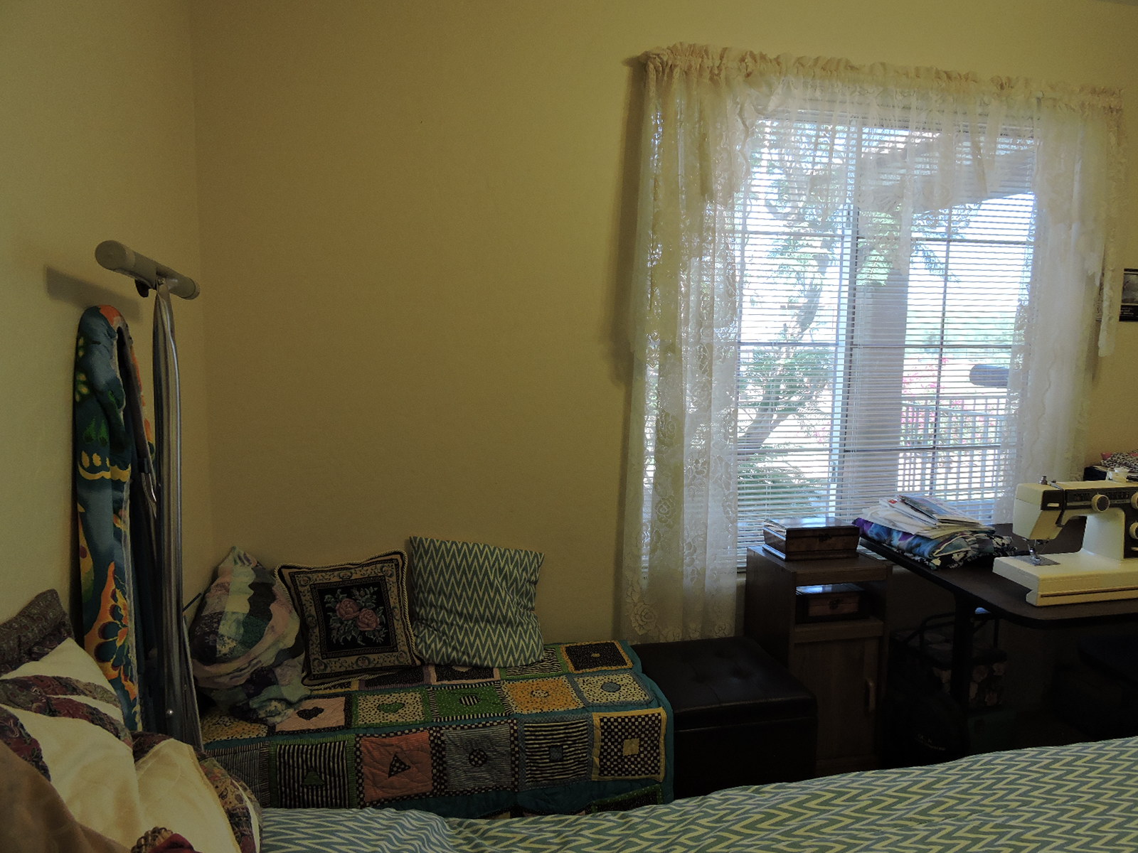 We had to take most of his furniture to the dump. Then I replaced his uncomfortable twin bed with a comfortable full bed that my daughter was selling, so that we could also use the room as a guest bedroom in case my son and his girlfriend came to visit. From there, I situated bookshelves, trunks, storage, and sewing tables around the edges of the room. I managed to squeeze all three sewing machines and a serger in there, and bonus! Because the new bed came with giant storage drawers underneath it, I was able to store most of my supplies in there rather than having them cluttering the table tops.